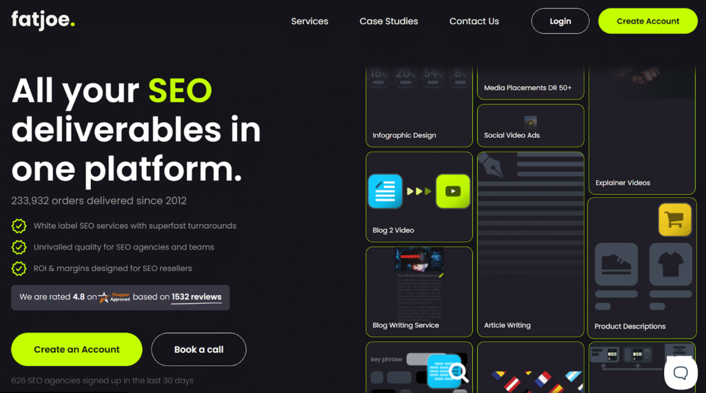 FatJoe is a white-label, scalable, and reliable company. Services are optimized for agencies needing fast delivery, quality, and detailed reporting, ensuring SEO objectives are effectively achieved.